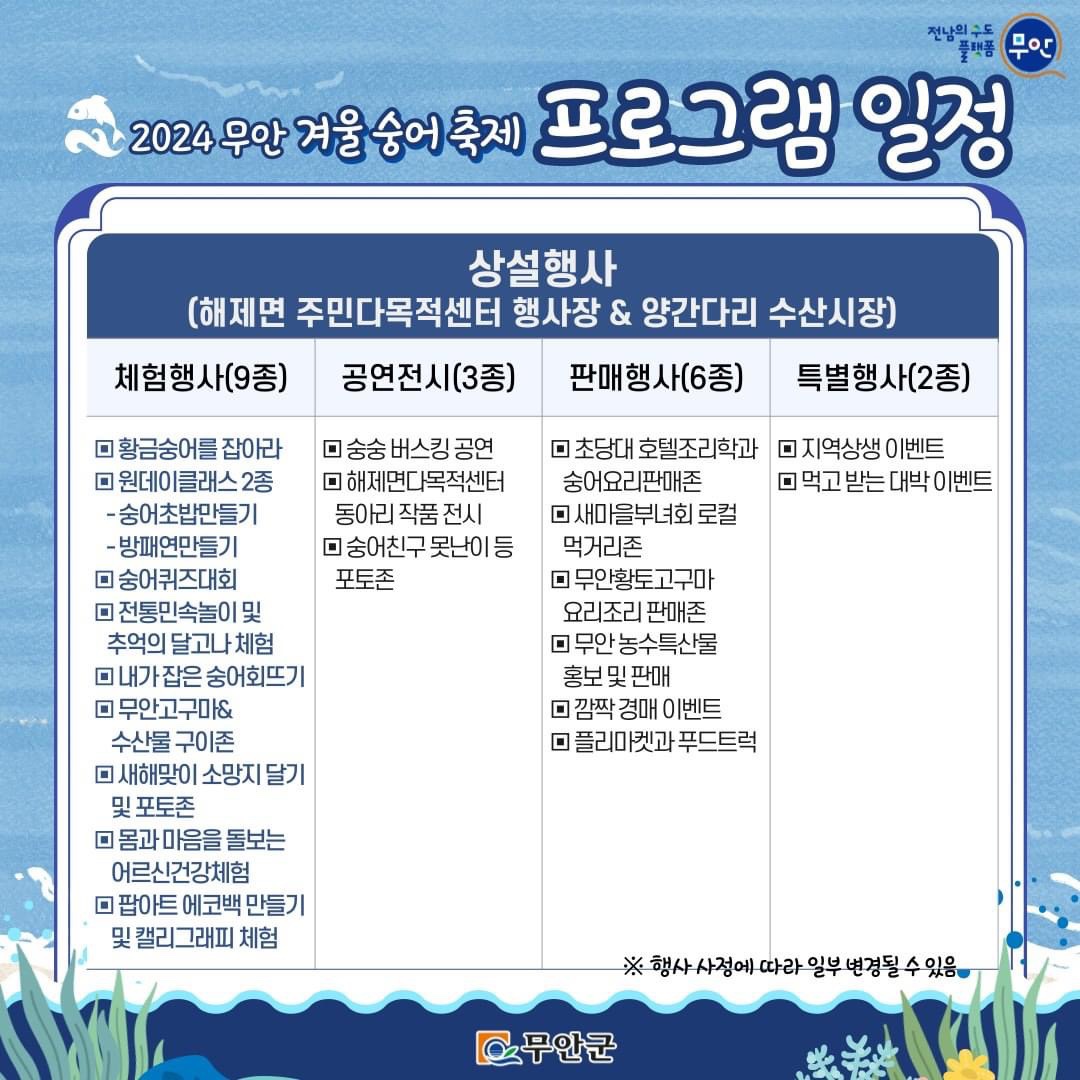 무안군이 무안의 청정 갯벌에서 자란 겨울철 대표 수산물 숭어축제입니다.