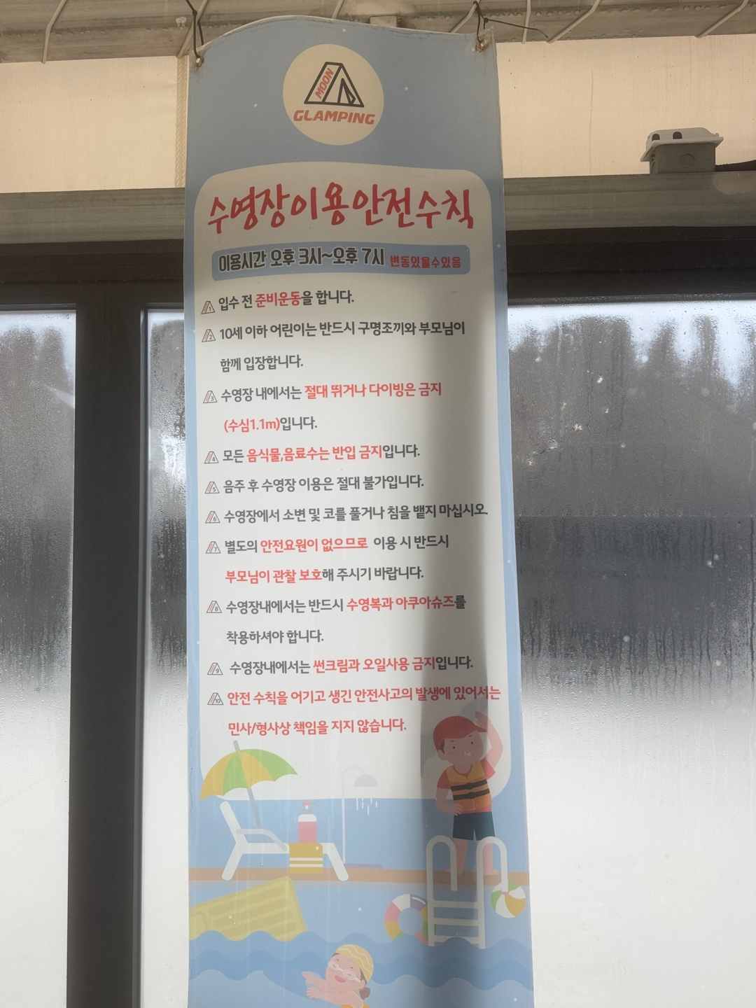 ※ 해당상품은 랜덤배정이기에 양옆애견동반동으로 배정받으실수있습니다 ※출입구 유리가아닌 천막객실 배정받으실수있습니다 ※수영장 수심 1.1m <수영장 이용규칙 > - 수영장 개장시간 15:00