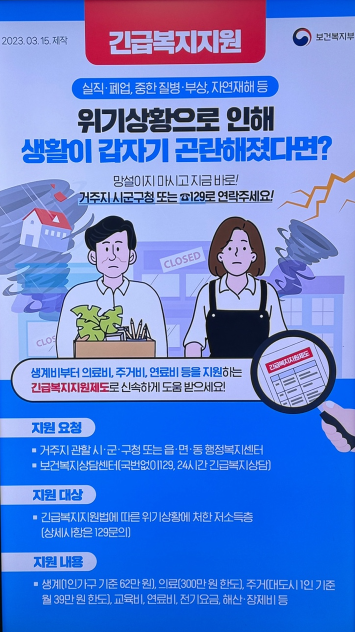 - 보건복지상담센터 (국번없이 129, 24시간 긴급복지 상담)