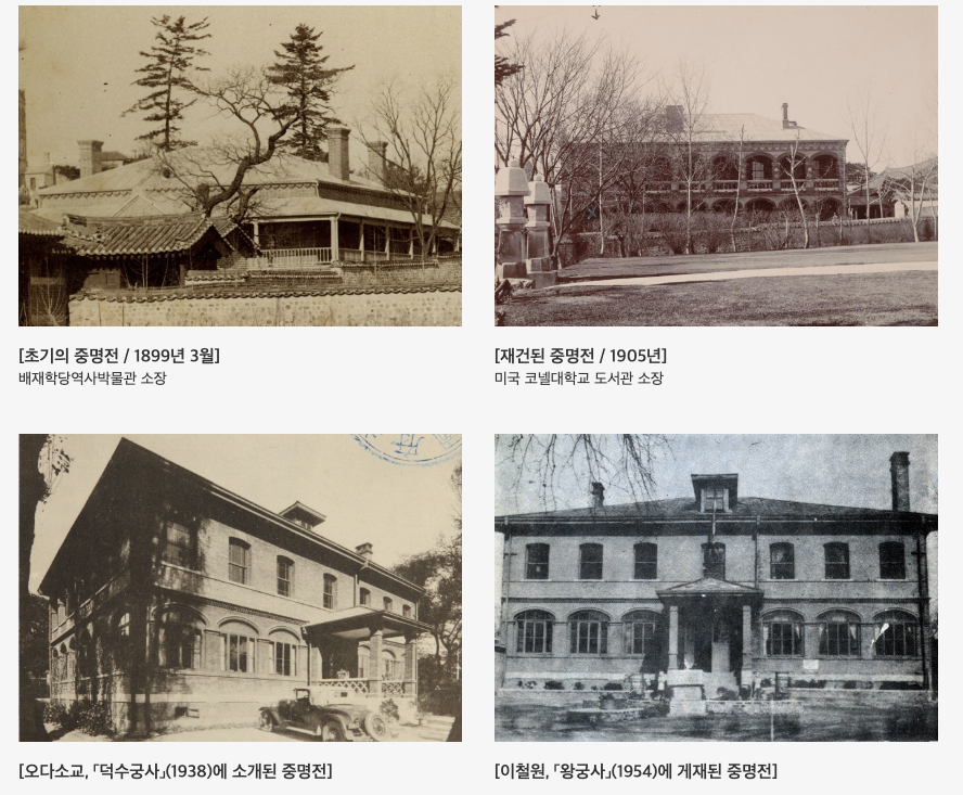 중명전은 1897년 경복궁의 집옥재와 같은 황실도서관으로 계획되어 1899년경에 완성된 건물이다.