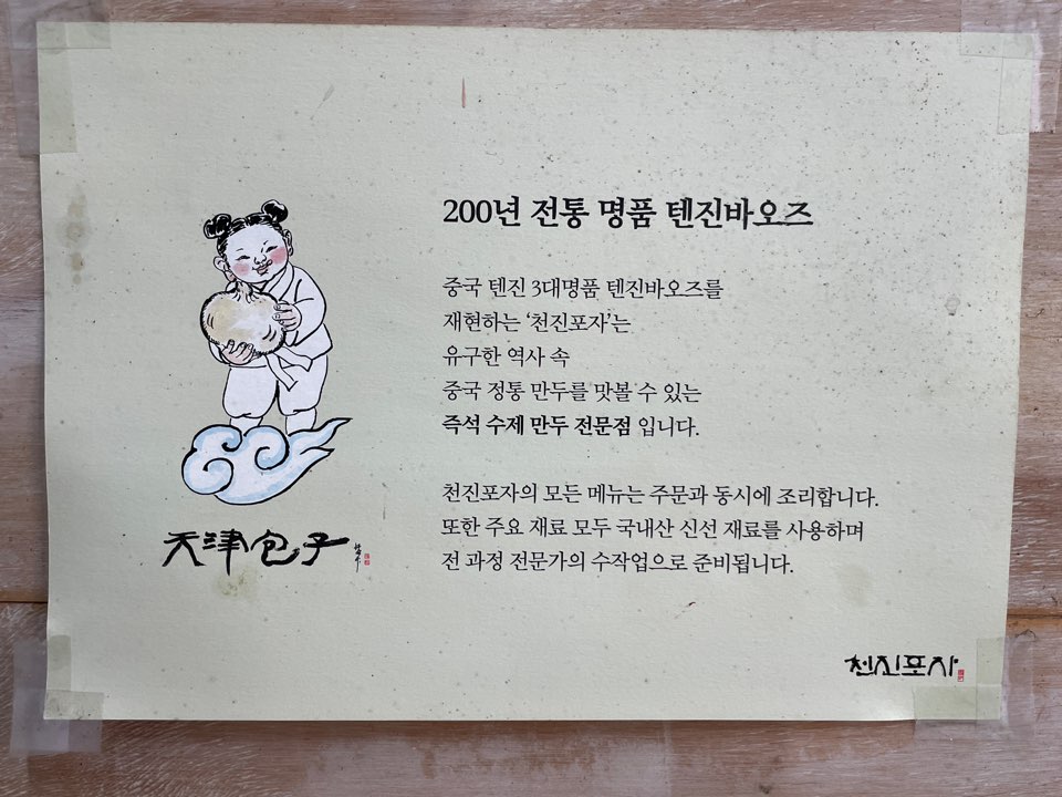 [천진포자]는 중국 텐진 3대 명품 텐진바오즈를 재현한 곳입니다. 오랜 역사 속에서 중국 정통 만두를 맛볼 수 있는 즉석 수제 만두 전문점입니다. 모든 메뉴는 주문과 동시에 조리하기에 기다림의 미학이 있어야 먹을 수 있는 곳입니다. 전 제조과정이 전문가의 수작업으로 준비됩니다.