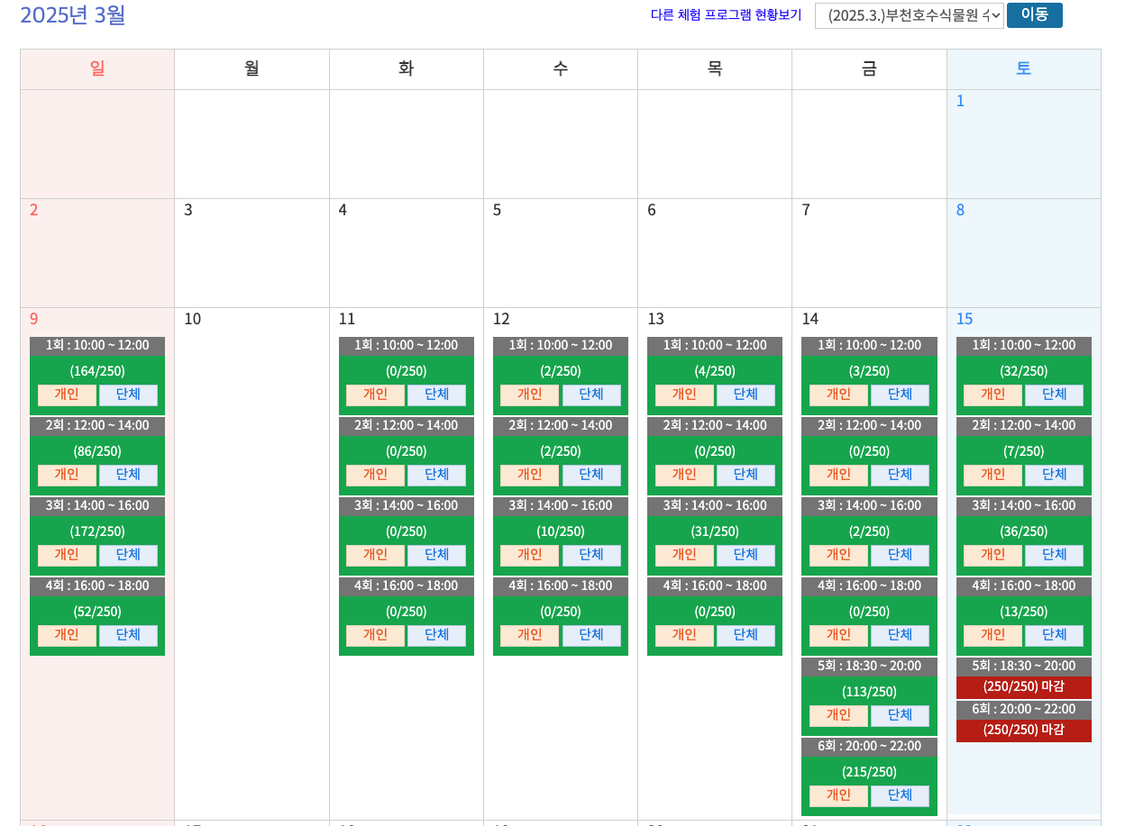 관람/체험 (2025.3.)부천호수식물원 수피아접수중 (2025.3.)부천호수식물원 수피아 체험장소 식물원(수피아) 운영시간 10:00~22:00 유의사항 ※ 부천시 홈페이지 공원서비스예약시스템 사전예약후 방