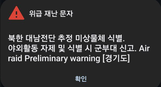 갑자스런 문자과 와서 많이 놀랐을것이다. 전쟁이 나지 않았나 하는 걱정이 있겠지만 미상 물체 발견하면 바로 가까운 군부대나 경찰에 신고하면 된다.