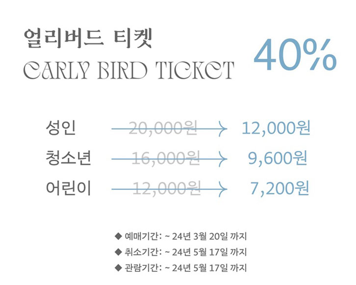 월 - 일요일10:00 - 19:40 (입장마감 19:00) ※ 설날 및 추석 당일 휴관 | 공휴일 정상운영