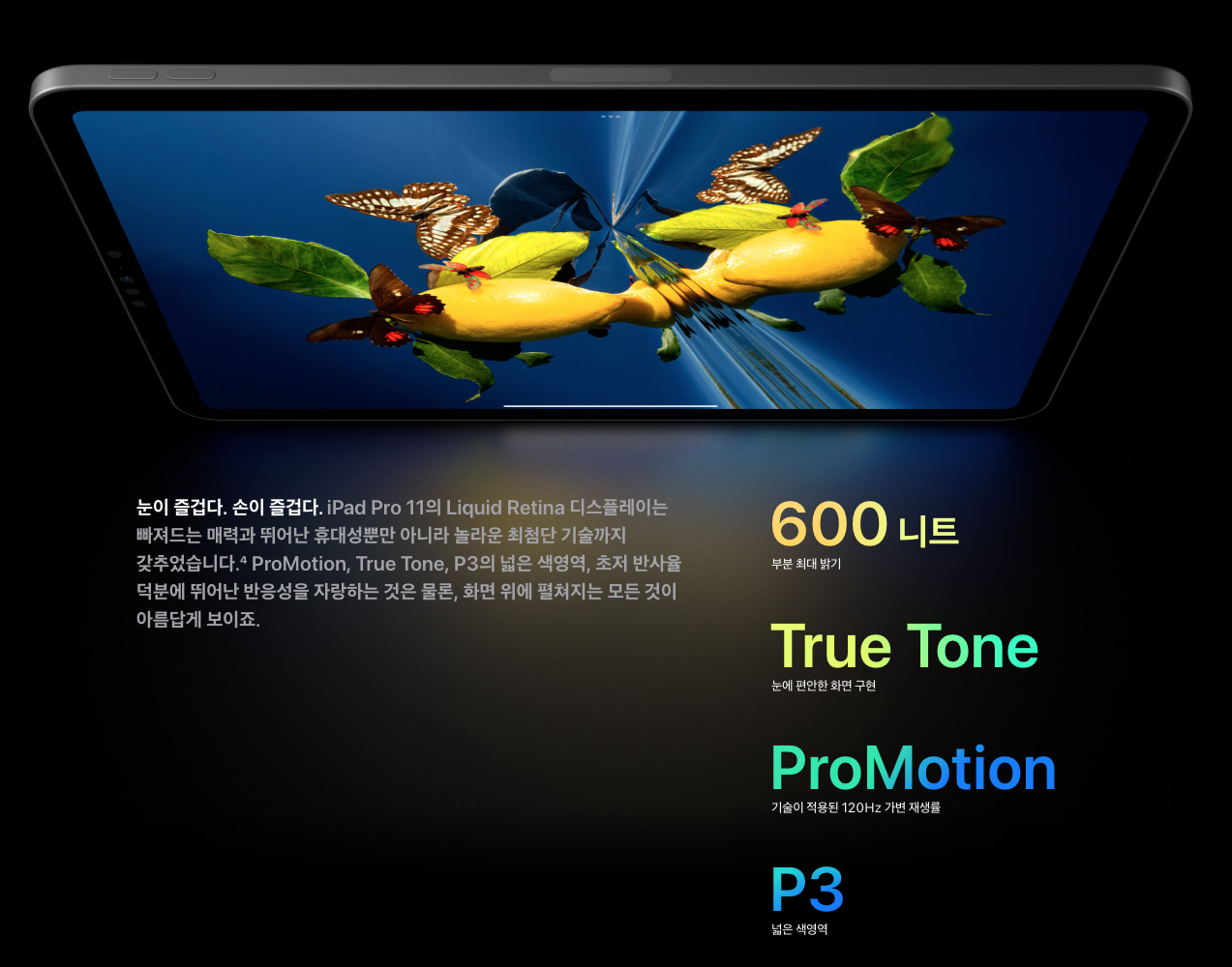 아이패드 6세대 11인치, 12인치 모델 2가지기 있는데. 12.9인치 모델에는 Liquid Retina XDR 디스플레이가 탑재되었다. 11인치와 12인치 모델이 디스플레이 기술에서 약간의 차이가 있다. Liquid Retina XDR 디스플레이를 오롯이 구현하고 사용하려면 12.9인치 모델을 구매해서 사용해야 한다. 1000 니트의 전체 화면 밝기와 1600 니트의 부분 최대 밝기를 경험할 수 있다.