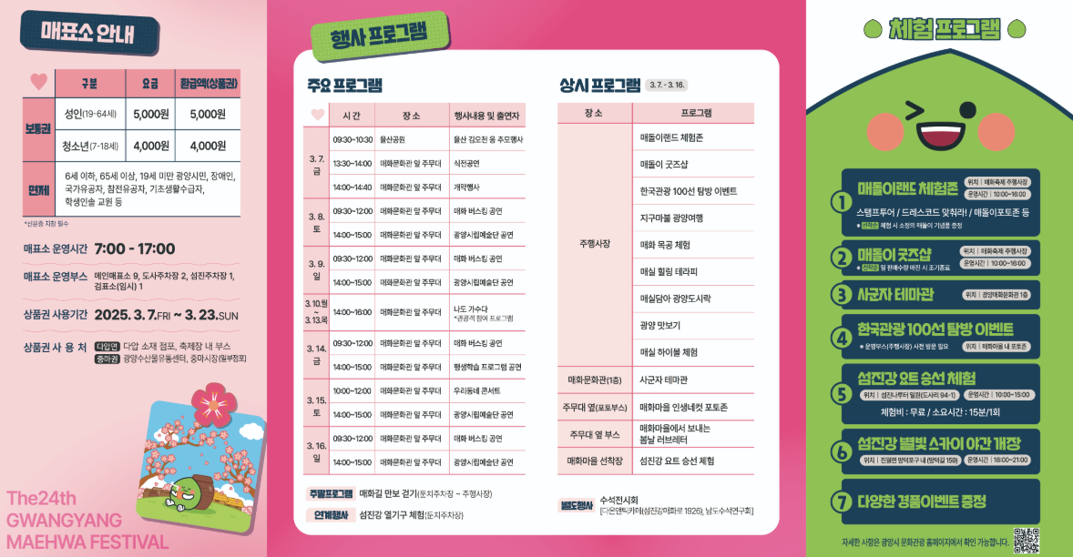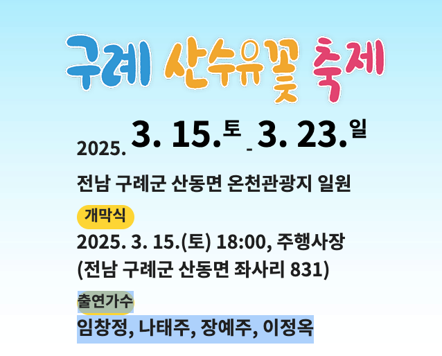 2025년 구례 산수유꽃 축제 축제기간일시2025년 3월 15일 ~ 3월 23일장소전남 구례군 산동면 온천관광지 일원개막식2025년 3월 15일(토) 18시 구례군 산동면 좌사리 831출연가수임창정, 나태주, 장