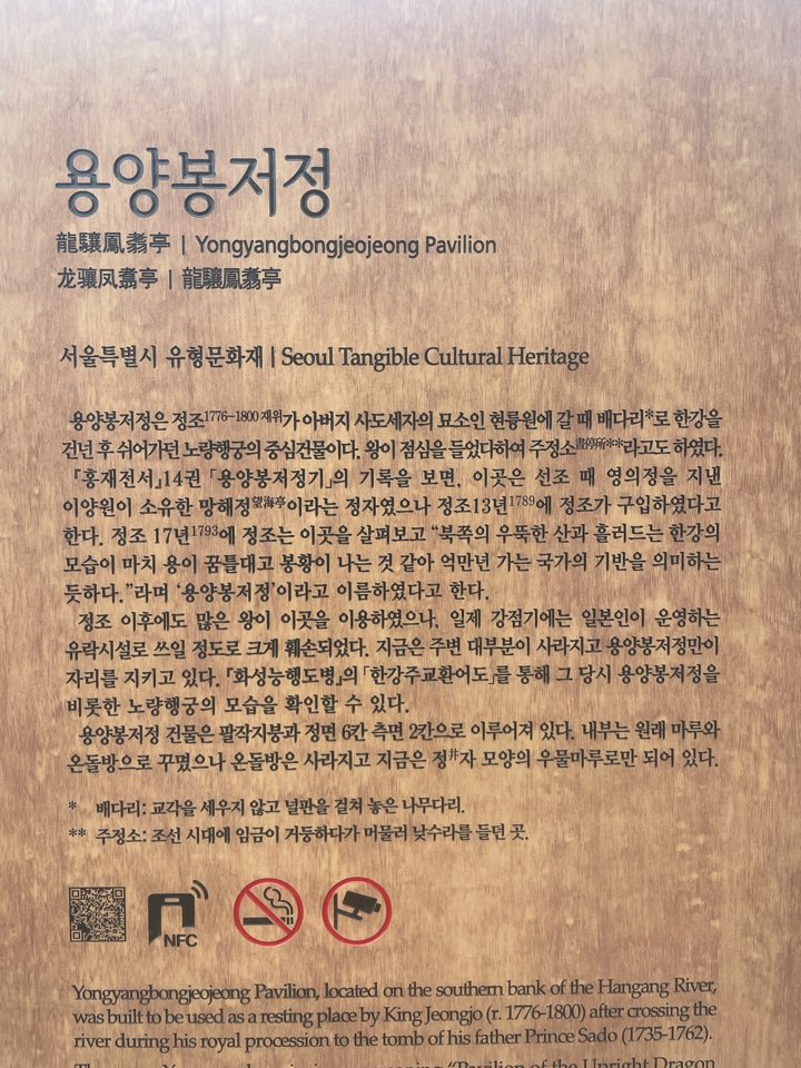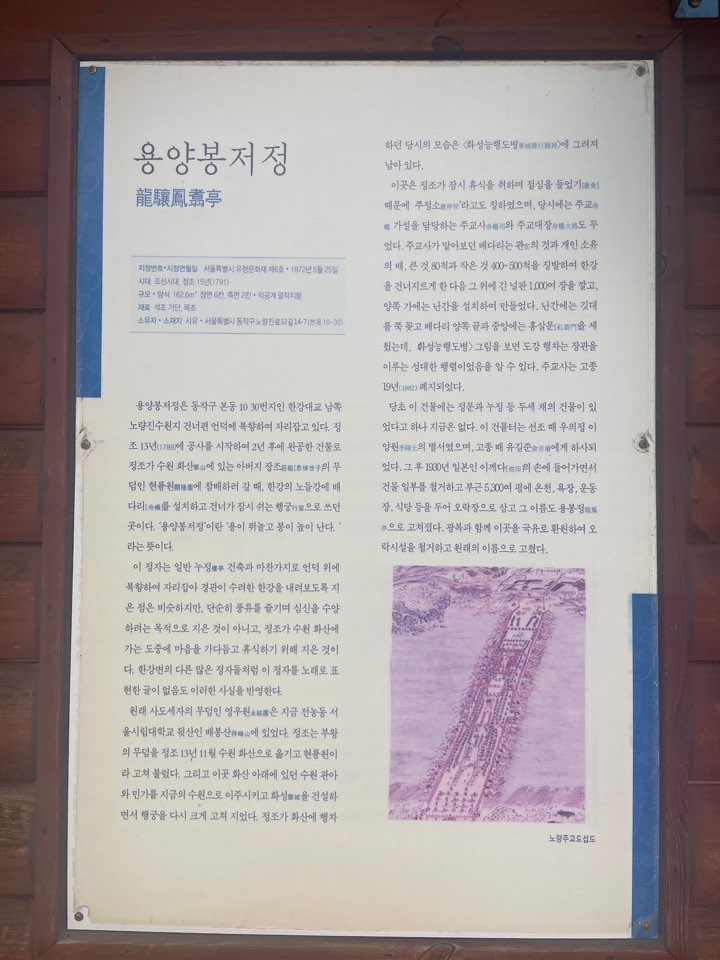 조선시대 행궁인 용양봉저정(龍驤鳳䎝亭)은 조선 22대 임금인 정조가 아버지 사도세자의 무덤인 현륭원에 참배하러 갈때 잠시 머물며 쉬었던 곳이다. 서울특별시 유형문화재 제 6호로 지정되어 있는 용양봉저정의 의미는 "한강 이북의 산봉우리들이 마치 용이 머리를 들며 솟아오르고 봉황이 날아오르는 것과 같다"는 의미로 이름이 붙여졌다.