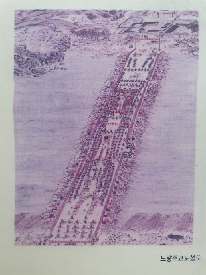 노량주교도섭도를 보면 한강을 건너기 위해서 담당 주교사가 담당을 해서 배다리를 만들었다. 배다리는 관의 개인 소유의 배를 모아서 만들었는데 큰것 80척, 작은 것 400~500척을 징발하여 한강을 건너지르게 하였다. 그 배 위에 긴 널판 1000여장을 깔았다. 양쪽 가에는 난간을 설치하여 만들었다고 한다.