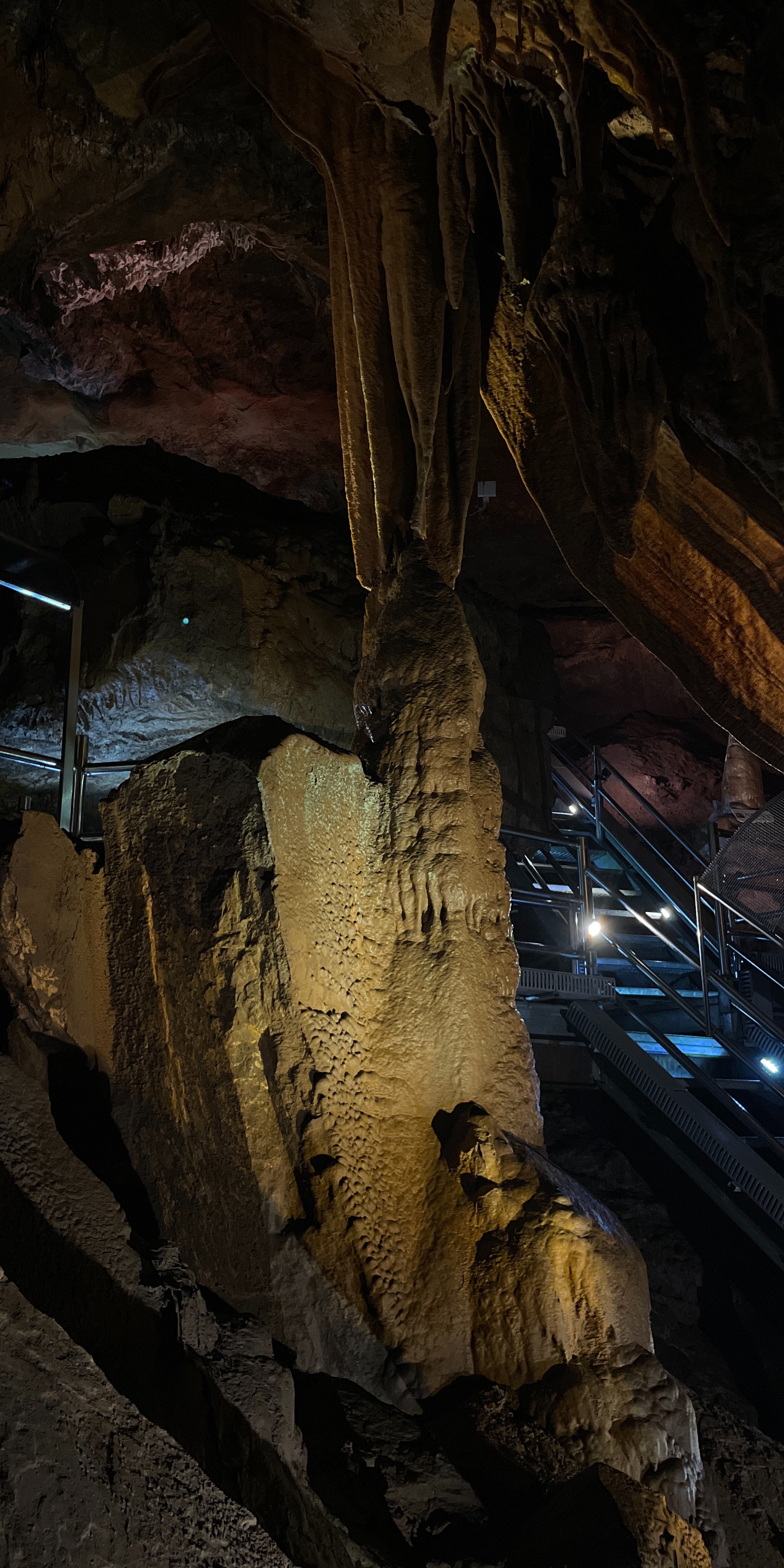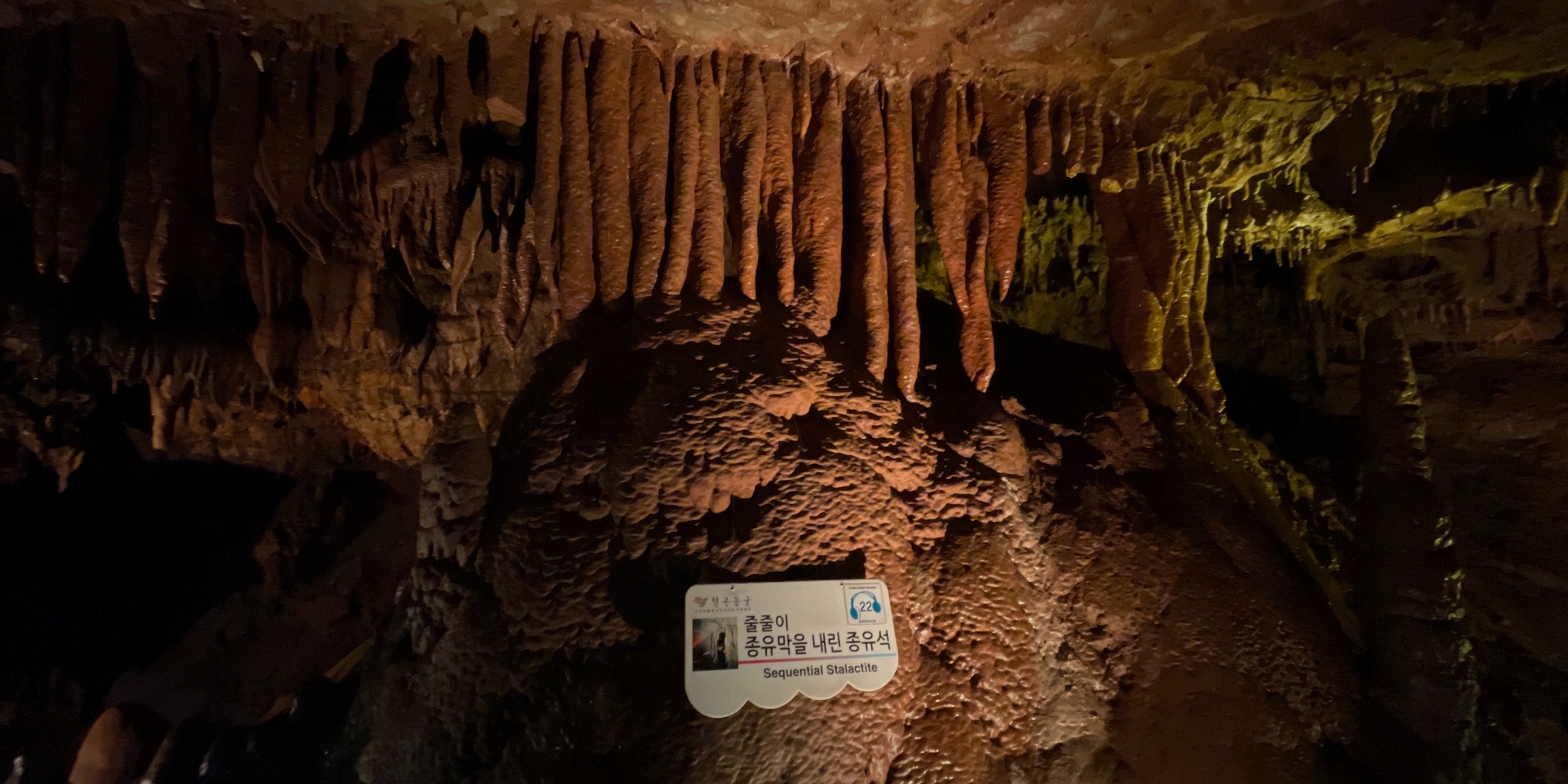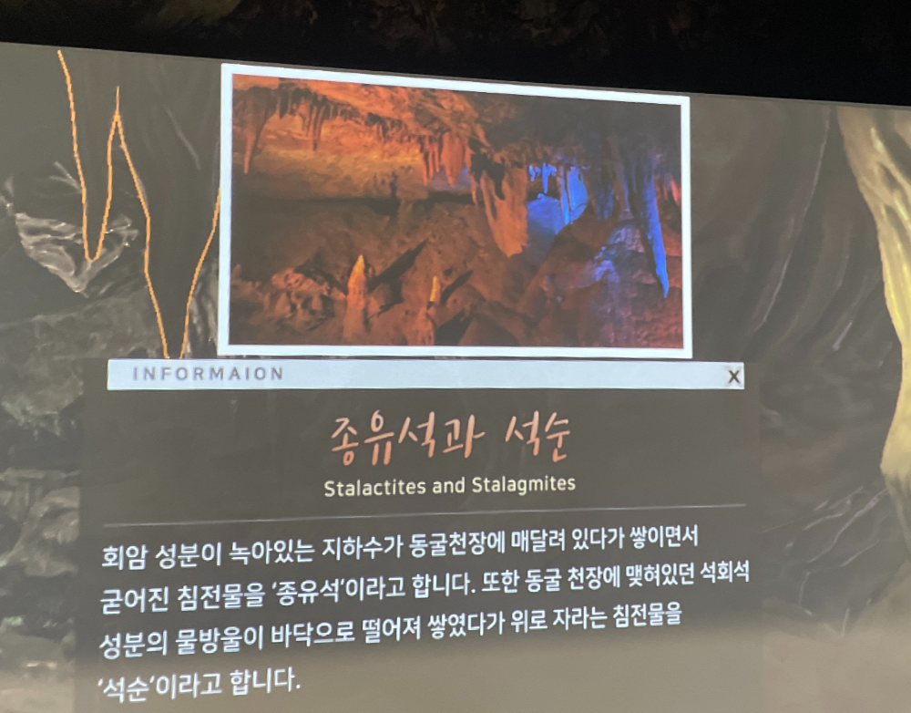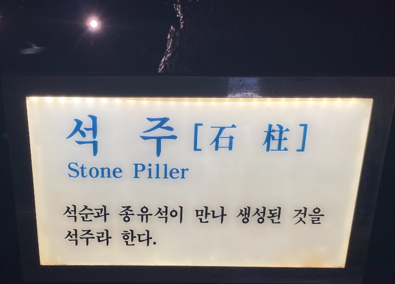 석순 -동굴 천장에 맺혀있던 석회석 성분의 물방울이 바닥으로 떨어져 쌓였다가 위로 자라는 침전물
