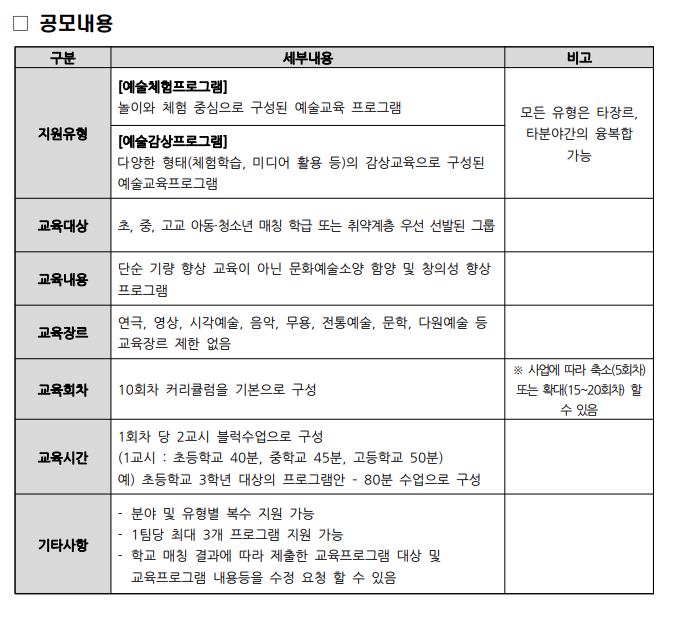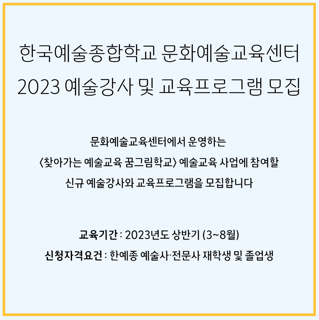 2. 공모 내용 : 2023년도 3월 ~8월 상반기에 운영하는 예술교육사업에 참여할 예술강사 및 교육프로그램 모집